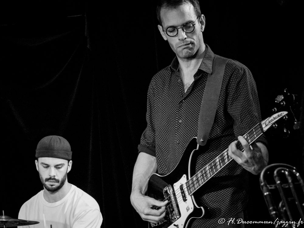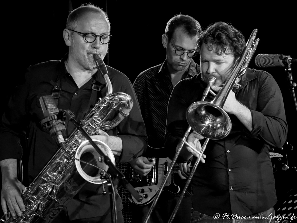 Jeudi 11 novembre, un grand choc m’attendait avec le trio du tromboniste suisse Samuel Blaser entouré du guitariste Marc Ducret et du batteur danois Peter Bruun. Un trio encore inattendu comme la semaine dernière qui s’est « débarrassé » de la contrebasse jugée trop encombrante dixit Blaser. Tous trois sont des ovnis surdoués et originaux qui chacun de leur côté ont su imposer leur marque très vite. Que dire alors de la somme des trois qui démultiplie les possibilités? Il faut déjà écouter « Les 18 Monologues Élastiques » du tromboniste pour saisir le champ d’action de ce musicien capable de toute expression avec cet instrument. Nourri aux scènes new-yorkaises et berlinoises, le tromboniste est revenu en Suisse et l’année 2020 a pour lui été une année prolifique avec pas moins de six disques. Le trio existe depuis 2013, enchainant les concerts sur toutes les scènes internationales et le public sait la chance qu’il a d’avoir devant lui ces fabuleux musiciens! Le disque « Taktlos Zurich 2017 » est joué principalement ce soir, les compositions étant de chacun, sauf une écrite à partir de la très courte « Fanfare for a new Théâtre » d’Igor Stravinsky écrite en 1964 durant 40 secondes et qui là est étirée à l’envie avec bonheur. Nous entendrons aussi deux compositions du très beau disque plus récent « Voyageurs » sorti ce mois d’octobre où Samuel Blaser est en duo avec Marc Ducret: « Des États Lumineux » signé par ce dernier et « Morse » ainsi qu’un joli lied traditionnel remixé à la sauce Blaser « Vreneli ab em Guggensberg« , et « Six » puis « It Began to get Dark » d’autres disques. Rappel très demandé sur « Held » (un des six disques du trio en 2020). Les trois musiciens se connaissent par cœur et jouent dans l’intensité, regards et gestes symbiotiques, le batteur faisant le trait d’union parfait entre deux gros félins qui gémissent ou feulent, se renvoyant la balle dans une connivence incroyable avec d’intenses moments de grâce. Alors, oui, c’est une musique difficile d’accès! Mais le lâcher-prise fait s’ouvrir les portes d’une félicité rare et on comprend l’ascension irrésistible de ces merveilleux musiciens!
